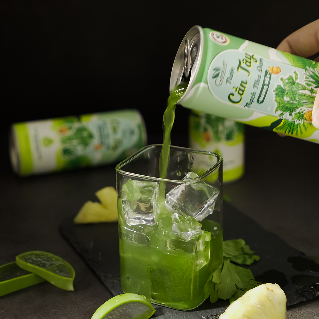 - Thành phần: Nước (50%), bột cần tây (19%), thạch nha đam (3%), đường mía, chất ổn định (INS327, INS418, INS466), chất điều chỉnh độ acid (INS330, INS331 (iii)), chất chống oxy hóa (INS316, INS386), hương dứa tổng hợp…