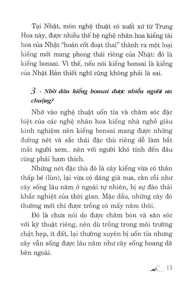 Mua tại Tiktok110 Câu Hỏi Đáp Chăm Sóc Và Tạo Dáng Bonsai Có nhiều quan niệm về Bonsai, trong khi người này xem Bonsai như là một trong những lẽ sống đầy ý nghĩa thiêng liêng cao cả của tư tưởng, triết học, tôn giáo, thì người khác lại xem đó chỉ là một thú vui lúc nhàn rỗi. Mỗi cây Bonsai là một tác phẩm nghệ thuật được lồng vào đó những kiến thức, ý tưởng và tình cảm của nghệ nhân tạo ra. Trong thời gian dài Bonsai là thú tiêu khiển của người quyền quý. Ngày nay được xem như là một nghệ thuật và cũng là một thú tiêu khiển của tất cả mọi người. Cuốn sách này sẽ cung cấp cho bạn đọc những bí quyết và phương cách chăm sóc, tạo dáng cho cây Bonsai của m.ình thêm đẹp mắt.