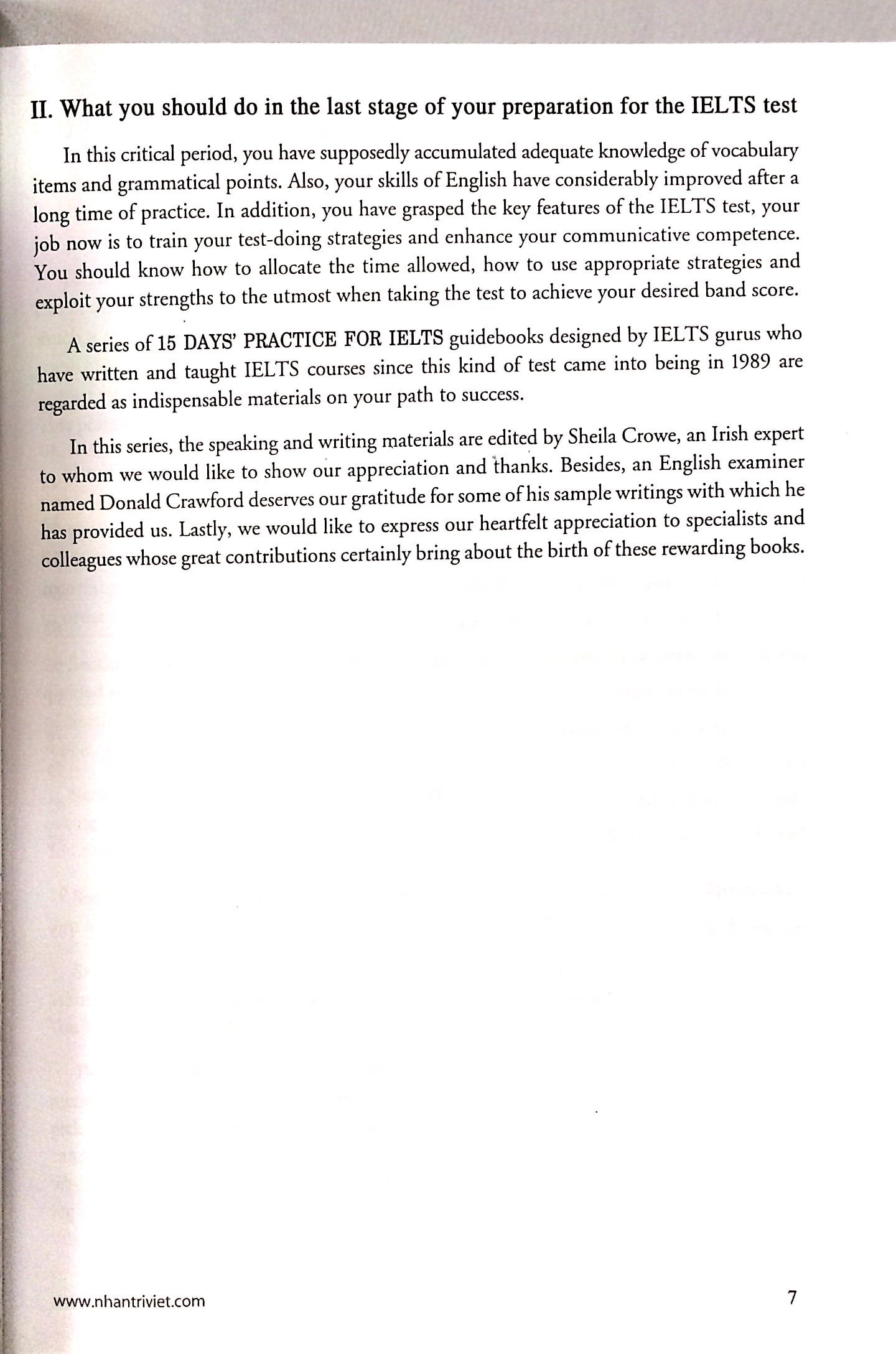 A series of 15 DAYS’ PRACTICE FOR IELTS guidebooks designed by IELTS gurus who have written and taught IELTS courses since this kind of test came into being in 1989 are regarded as indispensable materials on your path to success.