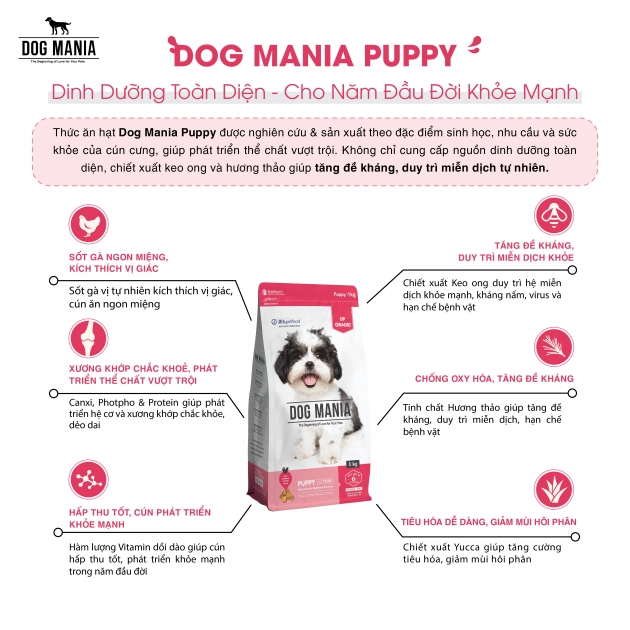 THÔNG TIN SẢN PHẨM THÀNH PHẦN Loại sản phẩm: Thức ăn cho chó Tên sản phẩm: Dog Mania Puppy Dạng sản phẩm: Dạng viên Màu sắc hạt: Màu nâu Áp dụng: Chó từ 3-12 tháng tuổi