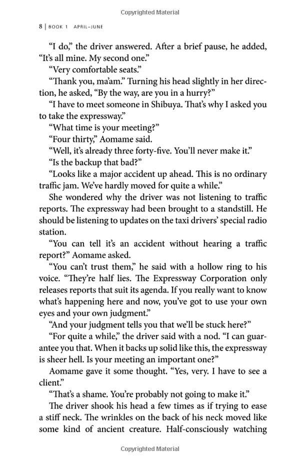In this world, the fates of two people, Tengo and Aomame, are closely intertwined. They are each, in their own way, doing something very dangerous. And in this world, there seems no way to save them both.