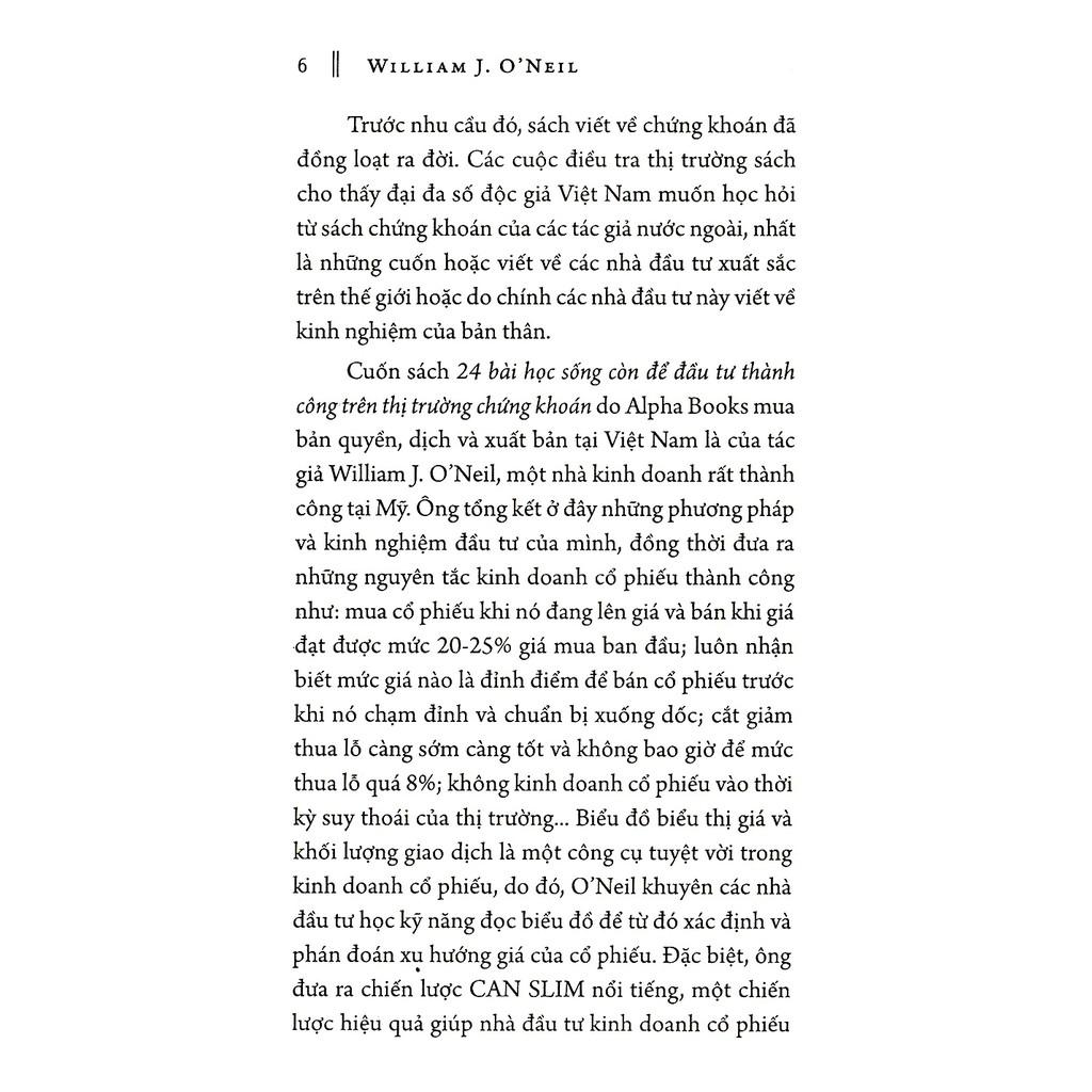 Trong 24 bài học sống còn để đầu tư thành công trên thị trường chứng khoán, tác giả đã đúc kết 40 năm kinh nghiệm, nghiên cứu và phân tích thị trường chứng khoán của mình thành các bài học về cách mua – bán cổ phiếu. Cuốn sách bao gồm tất cả mọi thứ, từ bảo vệ tài khoản đầu tư (luôn cắt lỗ ở mức 8% của giá mua) và cách thức đọc biểu đồ cơ bản (xác định đầu và đáy của thị trường) để hiểu được sức mạnh giá cả tương đối… và các lười khuyên về xây dựng một danh mục đầu tư tập trung.
