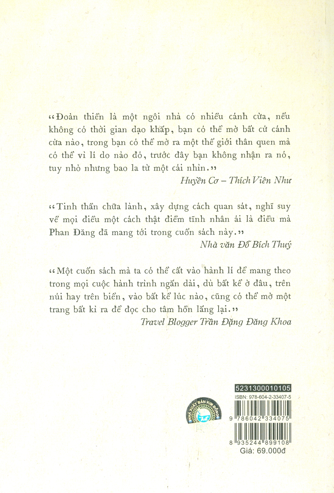 Là những đoản văn, ghi lại cảm nhận của tác giả bằng con mắt thiền, 39 Đoản Thiền Để Thấy - Những Câu Chuyện Chữa Lành là những suy tư tưởng chừng vụn vặt, nhưng đầy sâu lắng về cuộc đời và con người. Mặc dù tác giả sử dụng giọng viết rất giản dị, khiêm nhường, nhưng bạn đọc vẫn có thể nhận được ở đây những triết lí sâu sắc, những bài học mới mẻ về cuộc đời, phát hiện ra những điều vĩ đại đằng sau những cái đời thường, để sống bình tĩnh hơn, cảm nhận cuộc sống đầy đủ và trọn vẹn hơn.  Cuốn sách cũng đánh dấu một bước chuyển trong tư tưởng của Phan Đăng, giống như một hành trình đi tìm chính mình. Nếu như ở những cuốn sách trước (39 Câu Hỏi Cho Người Trẻ, 39 Cuộc Đối Thoại Cho Người Trẻ), chúng ta gặp một nhà báo Phan Đăng sắc sảo trong lập luận, minh bạch trong tư duy, thì trong cuốn sách này, chúng ta sẽ gặp một tác giả Phan Đăng vẫn sắc sảo đấy, vẫn minh bạch đấy, nhưng trầm tĩnh, thận trọng và chậm rãi hơn như một người giàu trải nghiệm. “Đoản thiền là một ngôi nhà có nhiều cánh cửa, nếu không có thời gian dạo khắp, bạn có thể mở bất cứ cánh cửa nào, trong bạn có thể mở ra một thế giới thân quen mà có thể vì lí do nào đó, trước đây bạn không nhận ra nó, tuy nhỏ nhưng bao la từ một cái nhìn.” - Huyền Cơ – Thích Viên Như “Tinh thần chữa lành, xây dựng cách quan sát, nghĩ suy về mọi điều một cách thật điềm tĩnh nhân ái là điều mà Phan Đăng đã mang tới trong cuốn sách này.”- Nhà văn Đỗ Bích Thuý “Một cuốn sách mà ta có thể cất vào hành lí để mang theo trong mọi cuộc hành trình ngắn dài, dù bất kể ở đâu, trên núi hay trên biển, vào bất kể lúc nào, cũng có thể mở một trang bất kì ra để đọc cho tâm hồn lắng lại.” - Travel Blogger Trần Đặng Đăng Khoa