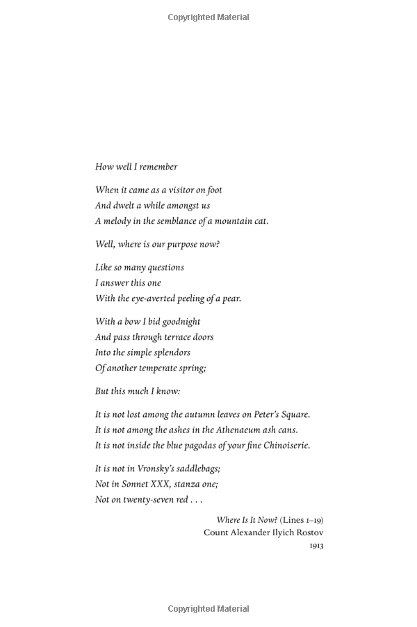On 21 June 1922, Count Alexander Rostov - recipient of the Order of Saint Andrew, member of the Jockey Club, Master of the Hunt - is escorted out of the Kremlin, across Red Square and through the elegant revolving doors of the Hotel Metropol.