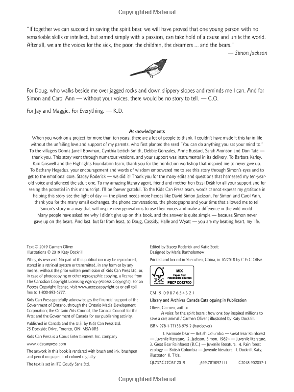 Carmen Oliver's inspiring true story is based on the early life of Simon Jackson, who founded the Spirit Bear Youth Coalition. On his remarkable journey to protect the spirit bears, he met Dr. Jane Goodall and eventually hiked the Great Bear Rainforest --- the home of these elusive animals. Katy Dockrill's captivating art adds depth and beauty to the story. Photos and additional details about Simon Jackson's life and about spirit bears are included in the end matter. Part of the CitizenKid collection, this book demonstrates how one child can be a voice for change. Simon's story is an excellent example of growth mindset at work, highlighting personal growth and overcoming obstacles through activism. This book can also be used to lead discussions about character education as it relates to courage, resilience and perseverance. In addition, it has strong science curriculum links to the environment, animal habitats and the effects of clear-cutting.