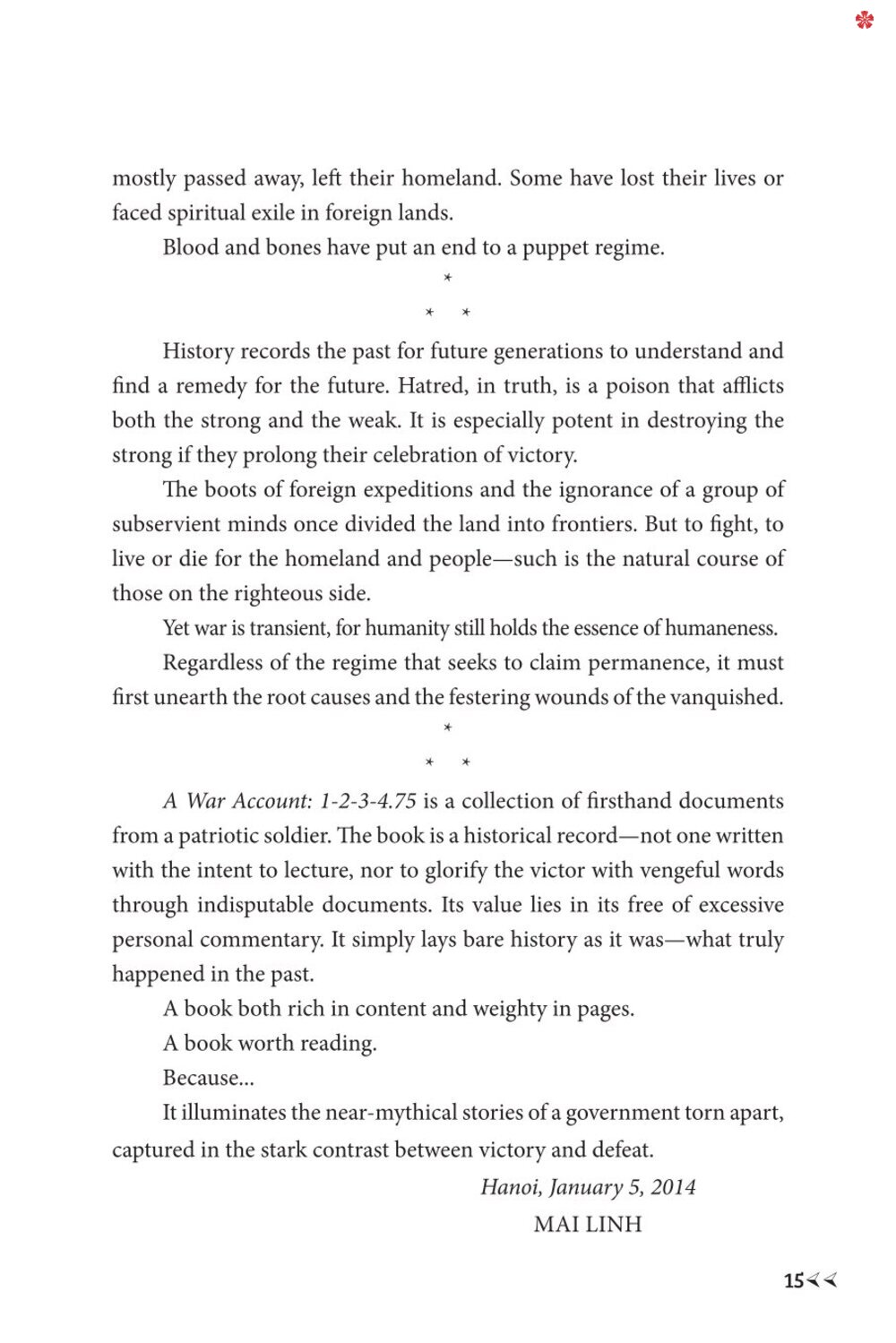 Looking even further back, the historic events of the liberation of the South (April 30, 1975) have been progressively sorted and analyzed, andtheir message to us today has become ever more profound. The Vietnamese version of the book A War Account: 1-2-3-4.75 by journalist and writer Tran Mai Hanh was first published by the  National Political Publishing House in April 2014. It has been continuously reprinted in 2015, 2016,2017, 2020 and 2025, and well-received as well as highly appreciated by readers. It has also won prestigious national and regional awards, including the2014 Literature Award from the Vietnam Writers’ Association and the 2015 S.E.A. Write Award. In 2017, the work was first translated into English, followed by translations into Lao in 2018 and Spanish in 2022 to introduce it to international readers. Since then, it has become one of the key publications promoting Vietnam’s diplomatic efforts.