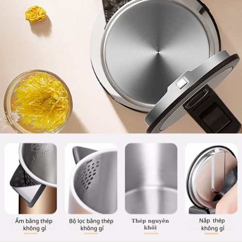 Kiểu dáng hiện đại đẹp mắt với chất liệu inox sáng bóng, Ruột ấm được đúc từ inox 304 nguyên khối tạo nên kết cấu vững chắc giúp tăng tuổi thọ ruột ấm lên đến 20 năm. Công suất lên đến 1800W, với mâm nhiệt rộng, tỏa nhiệt nhanh giúp nước được đun sôi nhanh chóng, tiết kiệm thời gian và điện năng. Với chỉ mất 3 phút để nước sôi . Chức Năng chống nóng và bỏng với cấu tạo 3 lớp, lớp trong cùng làm từ inox 304 đúc nguyên khối, Lớp ở giữa là nhựa PP cách nhiệt giúp giảm nóng, Lớp ngoài cùng là inox màu tự nhiên cao cấp. Ấm được trang bị thêm tính năng chống đun khô giúp đảm bảo sự an toàn với nguồn điện sinh hoạt. Chế độ tự ngắt điện khi nước sôi an toàn cho người sử dụng và tăng độ bền bỉ của ấm.