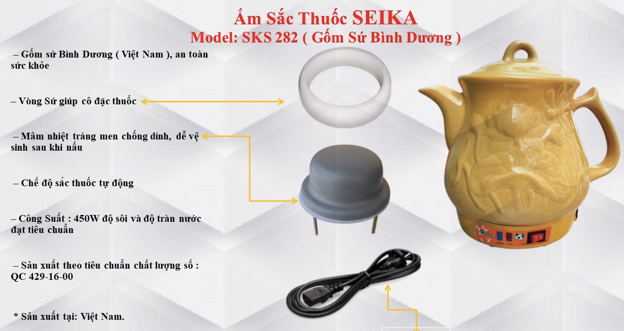 Giới Thiệu Siêu Sắc Thuốc tự động Công suất: 300W Dung tích: 3 lít Điện Thế/ tần số: 220V/50Hz Chất liệu: Gốm Bát Tràng Việt Nam Đèn báo: cóSiêu sắc thuốc tự động , có