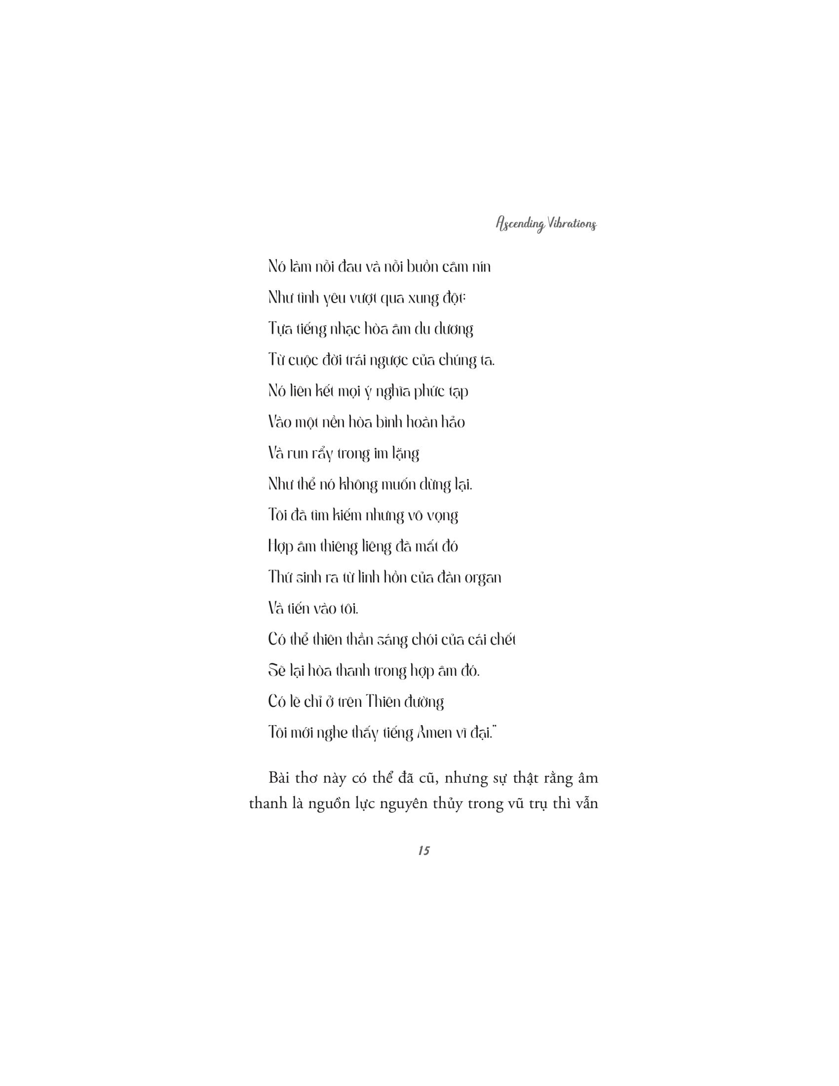 Một trong những thông điệp quan trọng của cuốn sách là sự kết nối sâu sắc giữa con người và vũ trụ thông qua âm thanh. Các rung động âm thanh không chỉ giúp giải phóng những cảm xúc bị kìm nén, mà còn mở ra những con đường năng lượng, giúp con người tiếp cận những tần số cao hơn, mang lại sự bình an và nhận thức sâu sắc về sự hiện diện và vai trò của m.ình trong vũ trụ.