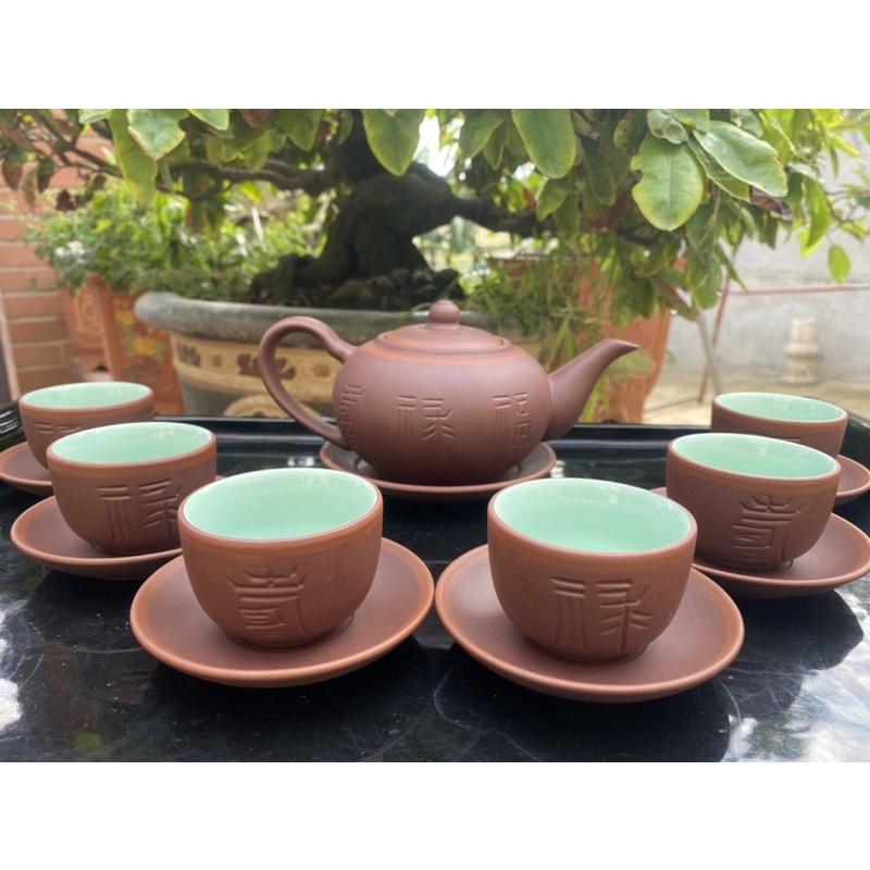 Bộ ấm chén tử sa nâu chén lòng xanh