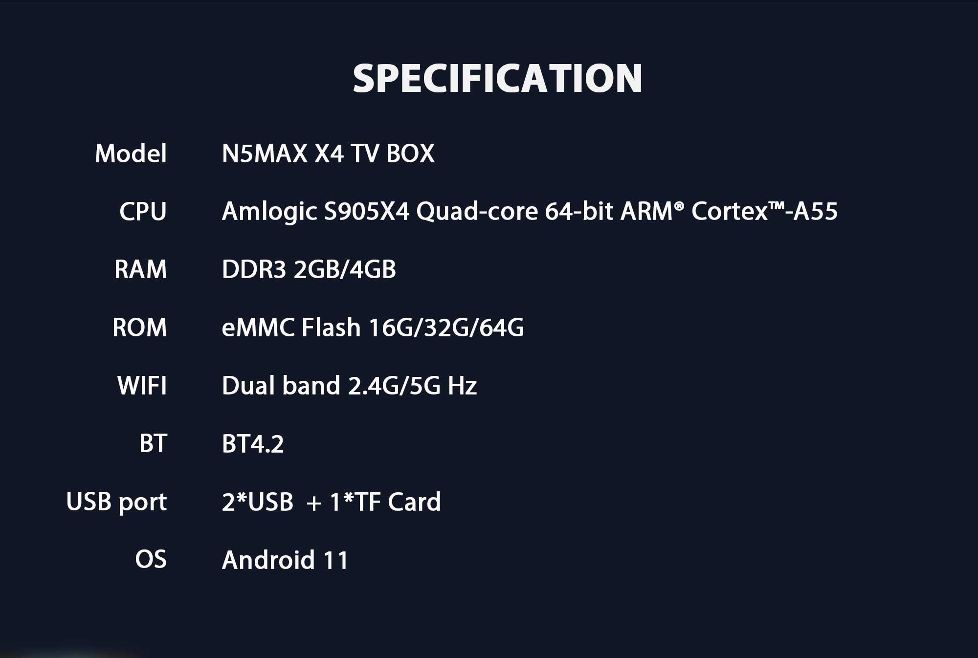 Chỉ cần nói tên bài hát hoặc nội dung cần tìm sẽ ra kết quả từ Google Amlogic S905X4 Amlogic S905X4 áp dụng bộ xử lý lõi tứ Cortex-A55, nó là "bộ xử lý ứng dụng tiên tiến được thiết kế cho các n5 max x4 OTT / IP Set-Top Box (STB) cao cấp. Các lõi Cortex-A55 cung cấp tới hai lần hiệu suất so với Cortex-A53 về điểm chuẩn bộ nhớ và cải thiện hiệu suất 20 đến 30% điển hình hơn cho các tác vụ thông thường ở cùng tần số. Hệ điều hành Android 11 Nó dựa trên hệ điều hành Android 11 mới nhất, với tốc độ cao và hiệu năng mượt mà, được thiết kế để biến TV thông thường của bạn thành một tivi thông minh. Độ phân giải 8K UHD Độ phân giải hình ảnh thật 8k có thể lên tới 7680 4320 để đạt được độ chính xác gấp 16 lần hình ảnh 1080p. USB 3.0 Tốc độ đọc / ghi cao. USB 3.0 có tốc độ tối đa 5 gigabit mỗi giây, về mặt lý thuyết nhanh hơn mười lần so với USB 2.0. WiFi băng tần kép 2.4G / 5G Với sự hỗ trợ cho băng tần 2.4Ghz và 5Ghz, nó có thể truyền lượng dữ liệu cao hơn. Thiết bị xem phim Full HD cõ hỗ trợ xem phim 4K cho các dòng TV cao cấp n5 max x4 được thiết kế không khác gì một chiếc điện thoại cao cấp ngoại trừ tính năng nge và gọi. Các bạn có thể vào mạng, lướt web, xem phim, xem bóng đá, đọc tin tức. Thiết bị n5 max x4 sẽ thay thế và bổ trợ cho các dòng TV đã là Smart Tv hoặc chỉ là TV thông thường. Đặc biết các bạn có thể thoải mái truy cập vào kho ứng dụng CH PAY của Google tải bất kỳ ứng dụng nào muốn vè TV nhà bạn. Google tải bất kỳ ứng dụng nào muốn vè TV nhà bạn. TẤT CẢ ĐÃ CÓ TRONG THIẾT BỊ ANDROID TV Về mặt trước nổi bật trên mặt sản phẩm là Logo Magicsee N5 max X4 được in nổi chính là điểm ấn tượng đầu tiên Sản phẩm có thiết kế nhỏ gọn với chiều ngang 10.5, chiều dài 10.5, chiều cao 2.8cm . android tivi box cũng chạy trên Android 11 Như đã thấy, ở mặt sau vẫn là cách bố trí các cổng kết nối quen thuộc, bao gồm 2 cổng USB ,1 khe thẻ, 1x AV, 1 cổng HDMI, cổng mạng JR45 và một cổng nguồn DC 5V-2A, cổng âm thanh số n5 max x4 hiện đang là sản phẩm được ưu chuộng trên thị trường không những bởi hiệu suất tuyệt vời của nó mà con do thiết kế . Với thiết kế mang phong cách cách của 1 siêu phẩm sản phẩm chỉ nhỏ gọn bằng 1 chiếc smart phone mang đến sự hiện đại và sang trang cho ngôi nhà bạn. CPU : Amlogic S905X4 64-bit Quad Core ARM Cortex A55 CPU GPU : G31 MP2 Bộ xử lý GPU Bộ nhớ LPDDR4: 4GB Rom: 32GB Wifi :IEEE 802.11 A/B/g/n/AC; 2.4G / 5G Hệ điều hành : Android 11 Bluetooth 1 HDMI,HD 2.1, Hỗ Trợ HD CEC, HDR và và 8K x 4K @ 24 Độ phân giải đầu ra 1 AV OUT 480i/576i tiêu chuẩn đầu ra độ nét 3 USB 1 USB 3.0 ; 2 USB 2.0 1 Giao Diện Ethernet; Hỗ Trợ 10/100M 1 TF Hỗ trợ 4GB / 16GB / 32GB / 64GB TV abbreviation TV, tivi
