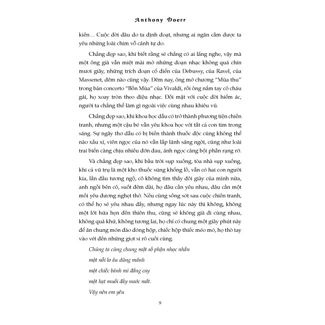 Cậu bé mồ côi Werner lớn lên cùng em gái trong một khu mỏ than ở Đức. Cậu bị một chiếc điện đài thô sơ mà hai anh em tìm được thu hút, sau này Werner trở thành chuyên gia lắp ráp và sửa chữa những thiết bị thông tin. Tài năng ấy đem lại cho cậu một vị trí trong học viện tàn bạo của Đoàn Thanh niên Hitler, sau đó là nhiệm vụ đặc biệt theo dấu quân kháng chiến. Ngày càng nhận thức được cái giá sinh mệnh con người phải trả cho trí tuệ của mình, Werner đi qua trung tâm cuộc chiến, cuối cùng, đến Saint-Malo, nơi cậu gặp gỡ Marie-Laure.