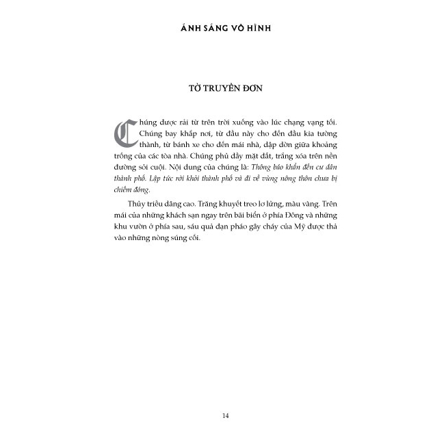 “Marie Laure sống cùng cha tại Paris, gần bảo tàng Lịch sử tự nhiên, nơi cha cô làm thợ khóa chính. Khi lên 6 tuổi, Marie Laure bị mù. Cha cô đã dựng một mô hình thu nhỏ hoàn chỉnh về khu phố hai cha con đang sống để cô có thể ghi nhớ bằng cách chạm và lần tìm đường về nhà. Năm Marie Laure 12 tuổi, Đức Quốc xã chiếm giữ Paris, cô cùng cha chạy trốn đến thành phố nằm trong tường thành, Saint-Malo, nơi ông chú thích ẩn dật của cha cô sống trong một ngôi nhà cao ven biển. Hai cha con họ đã mang theo một viên đá quý giá trị nhất và cũng nguy hiểm nhất viện bảo tàng.
