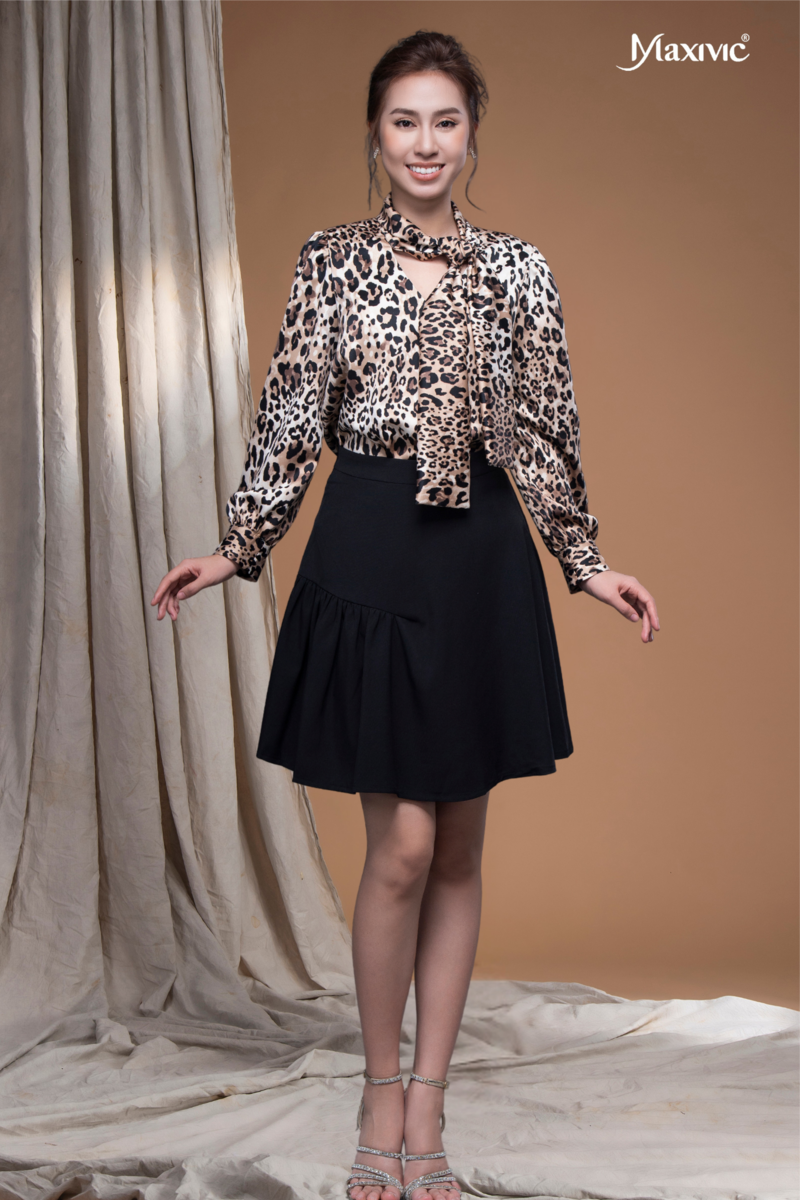 Áo sơ mi La Mộc họa tiết da beo thể hiện được nữ quyền. Thiết kế tay lỡ phồng và nhún nhẹ mang đến cảm giác thanh lịch cho nàng. Thiết kế với sự chỉnh