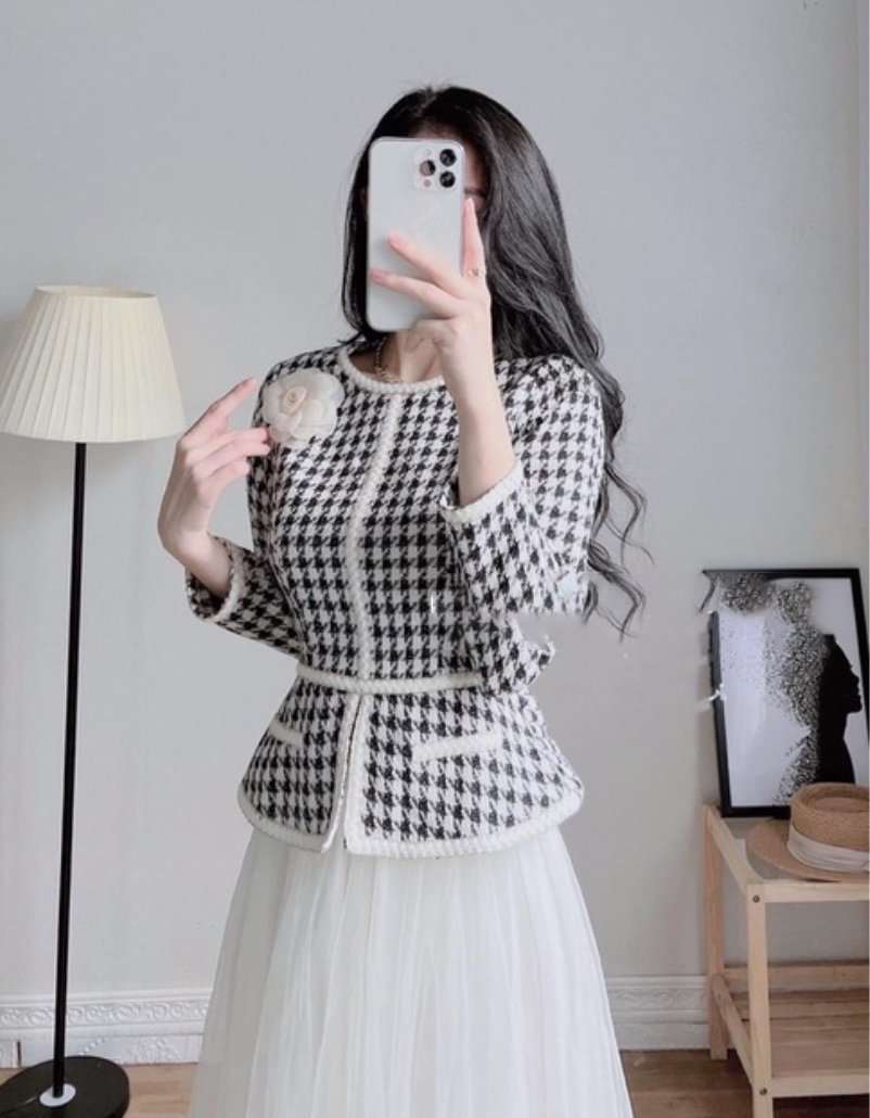 Áo khoác dạ Tweed dáng ngắn kẻ đen phong cách Hàn Quốc thanh lịch, trẻ trung - BD22S528