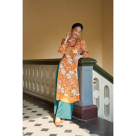 Thiết kế Áo dài nữ họa tiết hoa lá vàng đỏ cao cấp phong cách đường may tỉ mỉ. Áo thiết kế form vừa vặn giúp tôn được đường nét phong cách của các tính