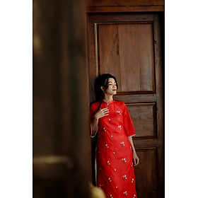 áo dài suông đỏ đô kết chim và hoa , tay lỡ loe