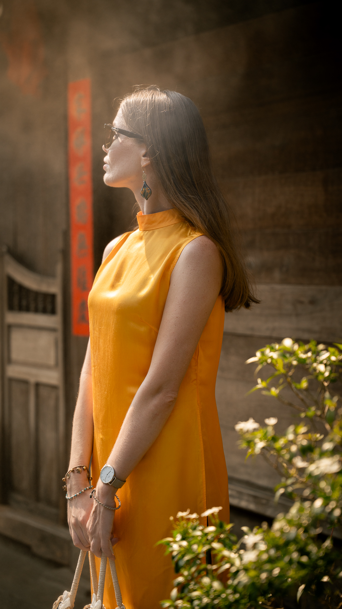 Mua tại TiktokTấm áo dài cách tân mang sắc màu óng ả nắng vàng lấy cảm hứng từ sắc hoa mùa thu nhiệt đới dã quỳ – loài hoa nổi bật với sắc vàng rực rỡ, phủ kín các sườn đồi cao nguyên. Với tinh thần luôn hướng về cảm xúc giao thoa giữa truyền thống và hiện đại, tấm áo dài Dã Quỳ được Hity thiết kế theo phong cách tối giản, không quá cầu kỳ nhưng vẫn giữ được vẻ đẹp tinh tế, tôn lên sự duyên dáng của người phụ nữ. Màu vàng nổi bật từ hoa dã quỳ tạo nên vẻ đẹp tự nhiên, tươi mới, mang đậm dấu ấn của mùa thu vùng nhiệt đới. Những chi tiết nhỏ như đường viền cổ áo, những đường cắt may khéo léo tạo nên nét chấm phá riêng, vừa giữ được vẻ cổ điển của áo dài truyền thống vừa thêm nét trẻ trung hiện đại. Chất liệu lụa tơ tằm được dệt từ làng lụa đũi Nam Cao, Thái Bình mềm mại, nhẹ nhàng và mát mẻ, giúp người mặc cảm nhận từng hơi thở đất trời thật nhẹ nhàng thanh cao. Áo dài kiểu dáng suông cách tân không tay Cổ cao 3.5cm Chích ben ngực và ben lưng Cài bằng dây khoá kéo sau lưng CHẤT LIỆU Lụa tơ tằm 100%, sợi tơ tằm tự nhiên Việt Nam Sản phẩm vải của HTX Làng nghề Lụa đũi Nam Cao Thái Bình với 100% từ tơ tằm tự nhiên đạt những tiêu chuẩn cao Dệt máy Khổ vải: 90cm Nghệ nhân: Ninh Trung Cắt may thủ công tinh tế tại Hity Atelier Nha Trang, Việt Nam Hướng dẫn sử dụng: Tránh ánh nắng mặt trời: Không phơi lụa tơ tằm dưới ánh nắng trực tiếp vì có thể làm vải bị phai màu và giảm độ bền của sợi. Giữ khô ráo: Không để lụa tiếp xúc lâu với nước hay các chất lỏng có thể gây ra các vết bẩn khó giặt. Không dùng nước hoa hay xịt khử mùi trực tiếp: Các chất hóa học trong nước hoa hay xịt khử mùi có thể làm hỏng sợi lụa và tạo vết ố. Cách giặt: Giặt bằng tay hoặc giặt hấp. Đổ đầy nước lạnh 24 - 35 độ C vào chậu hoặc bồn rửa. Thêm 5ml dầu gội hoặc xà bông dịu nhẹ, không chất tẩy vào chậu hoặc bồn rửa, khuấy đều cho nước lên bọt. Nhúng ngập đồ lụa vào bồn rửa, khuấy nhẹ để đồ lụa ngấm nước từ từ. bạn có thể ngâm đồ lụa từ 3-4 phút, sau đó vò nhẹ bằng tay. Xả 3 đến 4 lần nước lạnh làm sạch, sau đó nhấc đồ tơ tằm ra và giũ nước. Không vắt sẽ làm đồ lụa bị nhăn. Không vò hay vắt mạnh: Khi giặt, nhẹ nhàng bóp nhẹ để làm sạch và xả lại bằng nước sạch. Không vò hay vắt mạnh vì có thể làm hỏng cấu trúc của sợi. Không sử dụng nước tẩy / thuốc tẩy Sử dụng dấm hoặc chanh: Khi xả, có thể thêm một chút dấm hoặc nước chanh vào nước xả cuối để giữ cho lụa mềm mại và sáng bóng. Chỉ giặt riêng từng sản phẩm để tránh các sản phẩm loang màu sang nhau. Cách làm khô Phơi khô trên bề mặt phẳng, nơi thoáng gió, dưới bóng râm, tránh phơi trực tiêp dưới ánh nắng sẽ làm lụa khô, yếu sợi và phai màu. Không sử dụng máy sấy có thể làm co và làm hỏng cấu trúc của lụa. Cách ủi (là) Ủi ở nhiệt độ tối đa 110ºC (Chế độ Lụa Silk) Ủi bằng bàn ủi hơi nước Ủi mặt trái: Đặt một lớp vải mỏng lên trên lụa và là từ mặt trái để tránh làm bóng vải Lụa nên khô hoàn toàn trước khi ủi để tránh hiện tượng co rút. Bảo quản