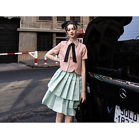 Áo kiểu nữ tay ngắn phồng lụa organza cao cấp hồng