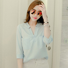 Áo kiểu cổ v tay lửng 2 túi Mô tả Size S: sản phẩm vòng eo rộng 64cm - 66cm, vòng ngực rộng 84cm-86cm, vòng mông rộng 86cm-88cm Size M: sản phẩm vòng eo rộng
