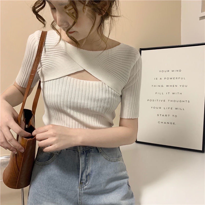 Áo Croptop Len Tăm Dệt Kim Cao Cấp Quảng ChâuTay Ngắn Có Cổ ôm dáng thon gọn sang chảnh này bạn có thể kết hợp với quần jean, quần ống rộđều rất đẹp và cá
