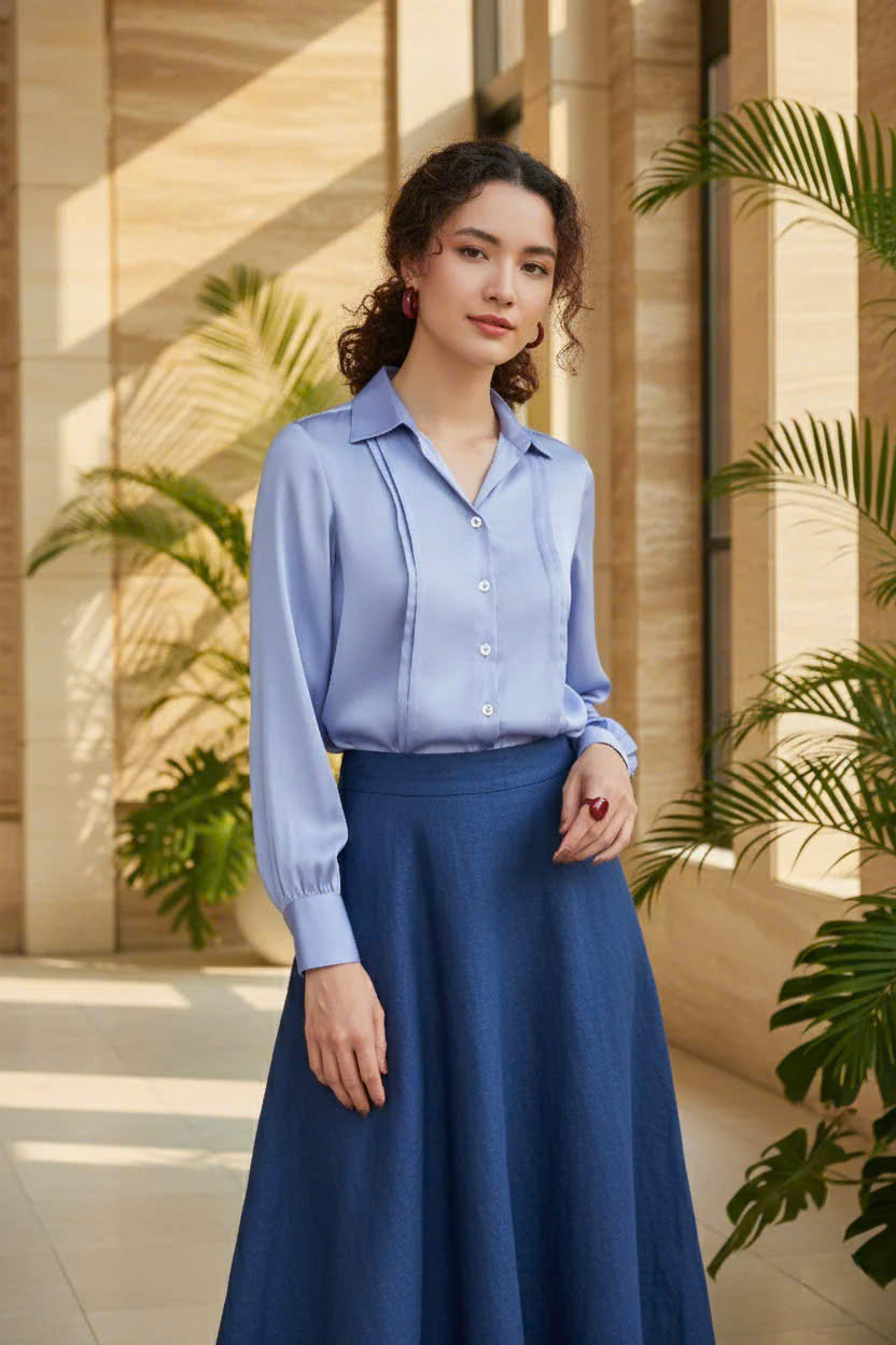 - Chất liệu mềm mại: Chất liệu là điểm nhấn quan trọng nhất. Lụa tổng hợp tạo độ rủ tự nhiên, mềm mại trên da, mang lại cảm giác mát lạnh trong ngày hè và giữ được sự sang trọng, đứng dáng cần thiết cho môi trường làm việc. Ánh sáng vàng của buổi chiều tà càng làm nổi bật độ bóng nhẹ (sheen) của lụa, khiến bạn tỏa sáng một cách tự nhiên.