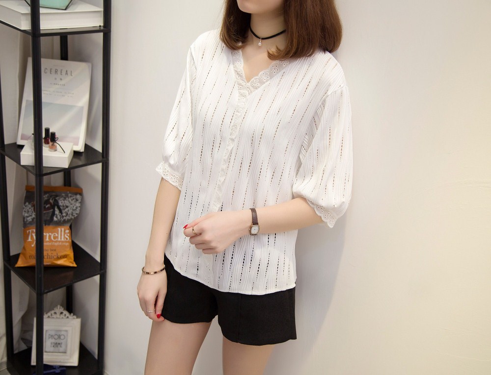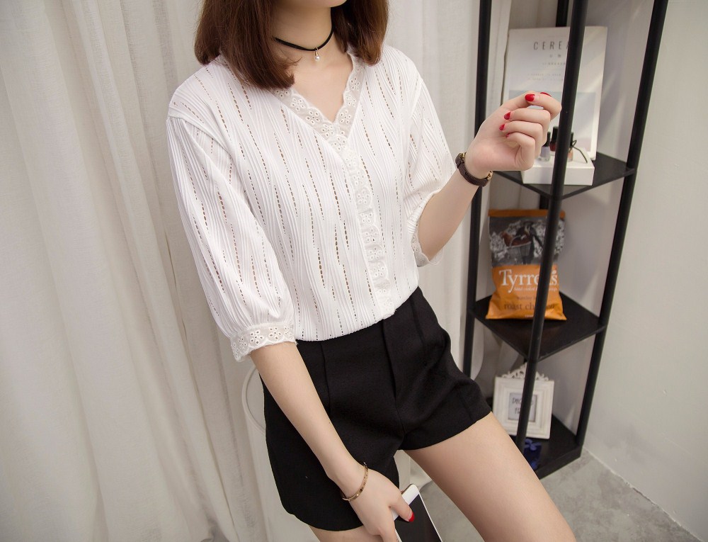 ✨Áo sơ mi nữ công sở cổ V thanh lịch, họa tiết trơn phối viền ren siêu xinh, phong cách Hàn Quốc HB185