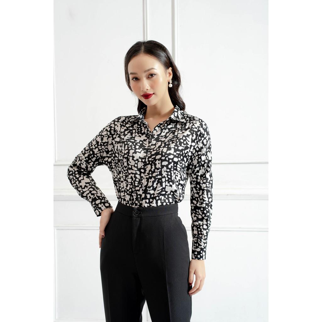 ✨Áo sơ mi nữ Tri'C Luxury họa tiết tay dài Đen S011119