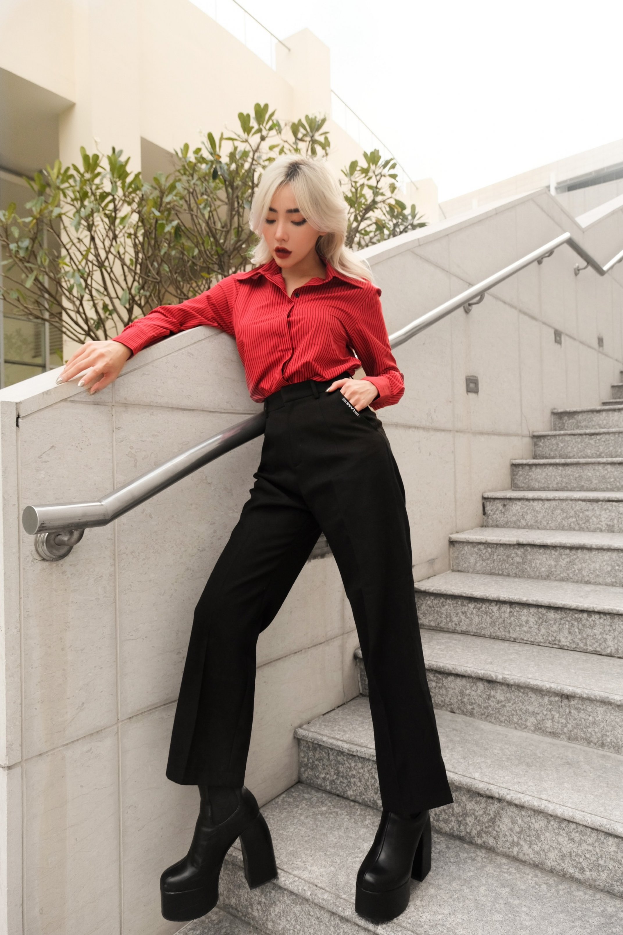 CHẤT SOMI COTTON PHA, ĐỨNG PHOM ÁO MÀU ĐỎ SỌC ĐEN ÁO CỔ SOMI, TAY DÀI, NẸP ÁO GIẤU NÚT PHOM CĂN BẢN SUÔN ĐIỂM NHẤN TAG LOGO NGAY NẸP ÁO