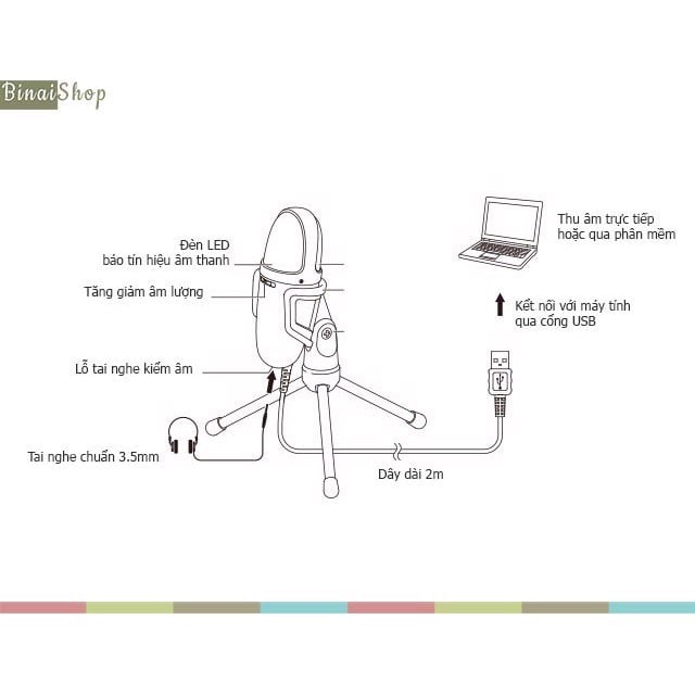 THÔNG SỐ KỸ THUẬT Frequency Response 20~20,000 Hz Bit Depth 16bit Sample Rate 44.1kHz / 48kHz Power Supply USB Power (5V 100mA) Dimensions 132 mm long, Ø49 mm maximum diameter Weight Approx. 252g (with USB cord) Cable 2m Connector USB-type A Accessories Tripod desk stand (205 mm long x Ø210 mm x 154 mm height)