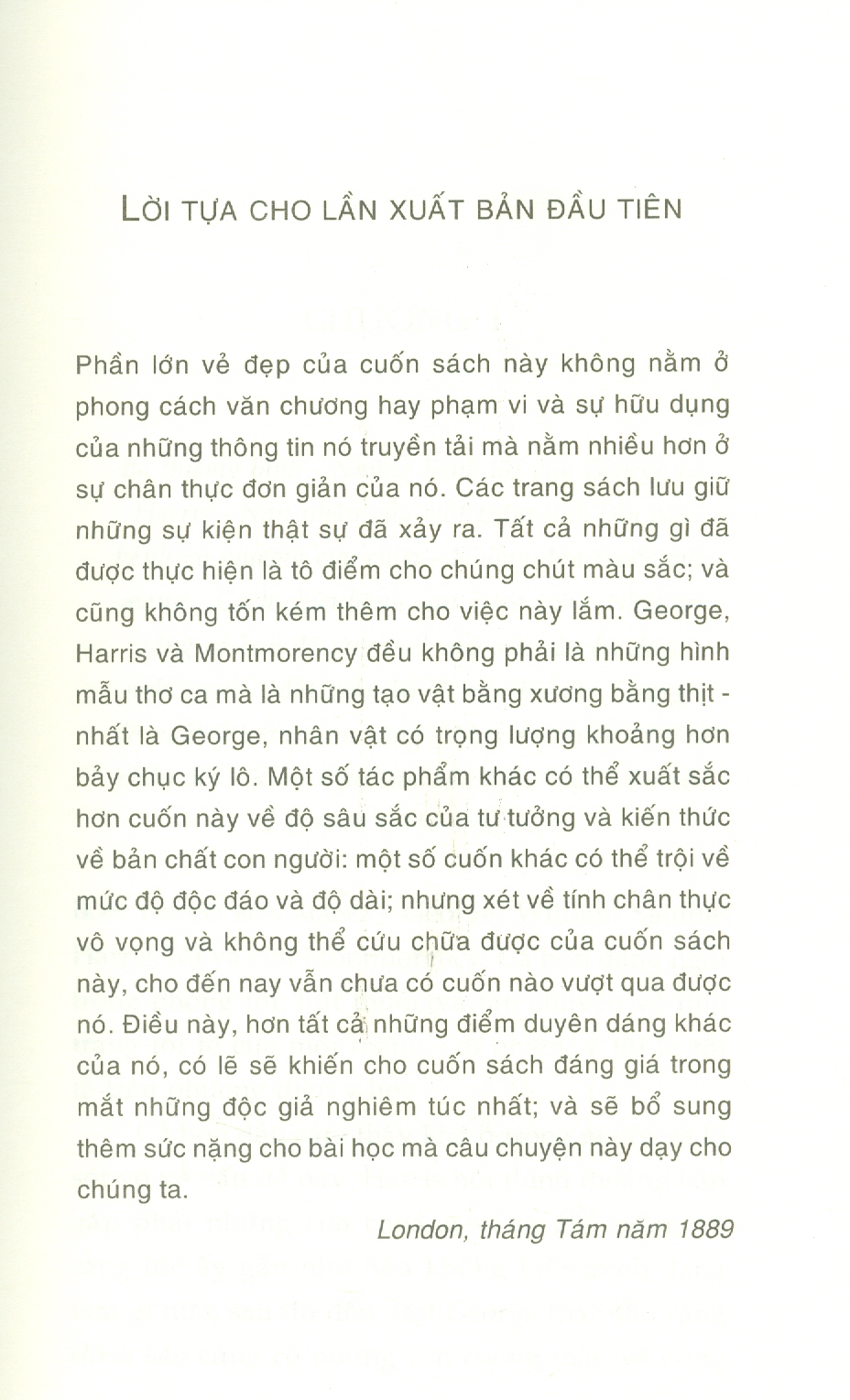 Nhờ đó, độc giả có thể ngấu nghiến từng câu từng chữ những câu chuyện ly kỳ hấp dẫn mà gã J. ấy đã vui lòng kể lại, có thể xuýt xoa trước tầng tầng lớp lớp kiến thức văn hóa, lịch sử, địa lý trong tác phẩm, có thể tấm tắc trước văn phong, có thể cười lăn trước những chi tiết khôn lường, có thể vỗ đùi đánh đét mà ngưỡng mộ văn tài của tác giả. Và, xin nhắc độc giả rằng, đây không phải một câu chuyện, đây là bản tường thuật chân thực không thể bỏ lỡ về một chuyến du hành sông nước “độc nhất vô nhị”…