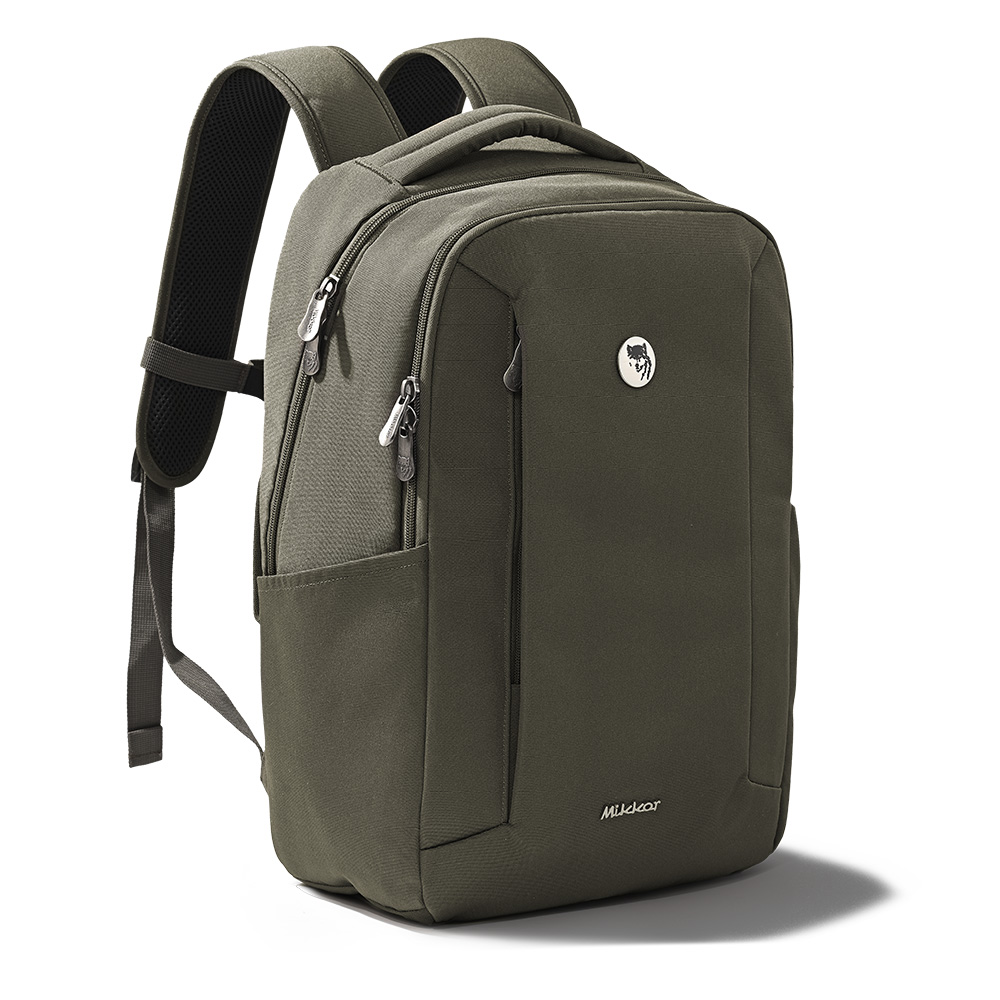Mặt trước balo đính logo chú sói biểu tượng thương hiệu và logo hợp kim MIKKOR nổi bật.