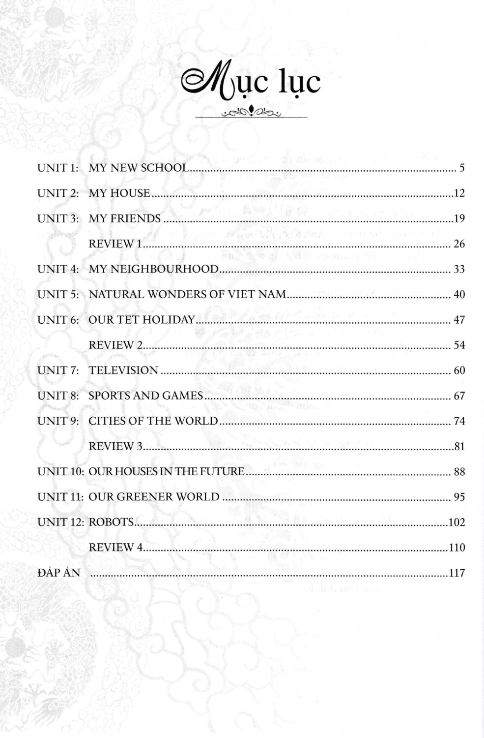 · Phần F – Writing: các bài tập sắp xếp câu, viết lại câu giúp luyện tập kỹ năng viết. Sau 3 đơn vị bài tập có một bài ôn tập (Review) nhằm giúp các em ôn luyện và củng cố kiến thức đã học.