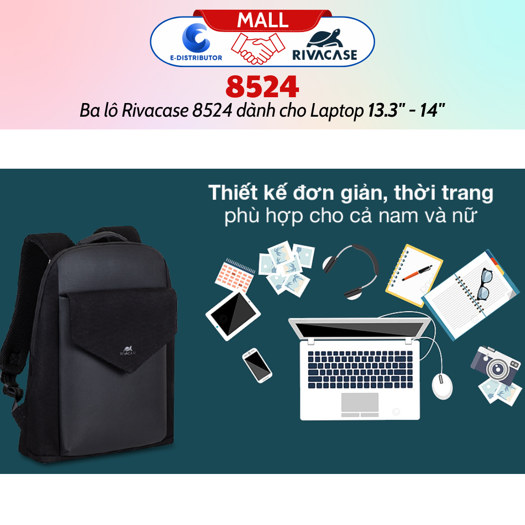 • Ngoài ra, Rivacase 8524 có thêm túi có khóa kéo phía trước thích hợp dành cho smartphone, danh thiếp, phụ kiện và dây treo chìa khóa có thể tháo rời