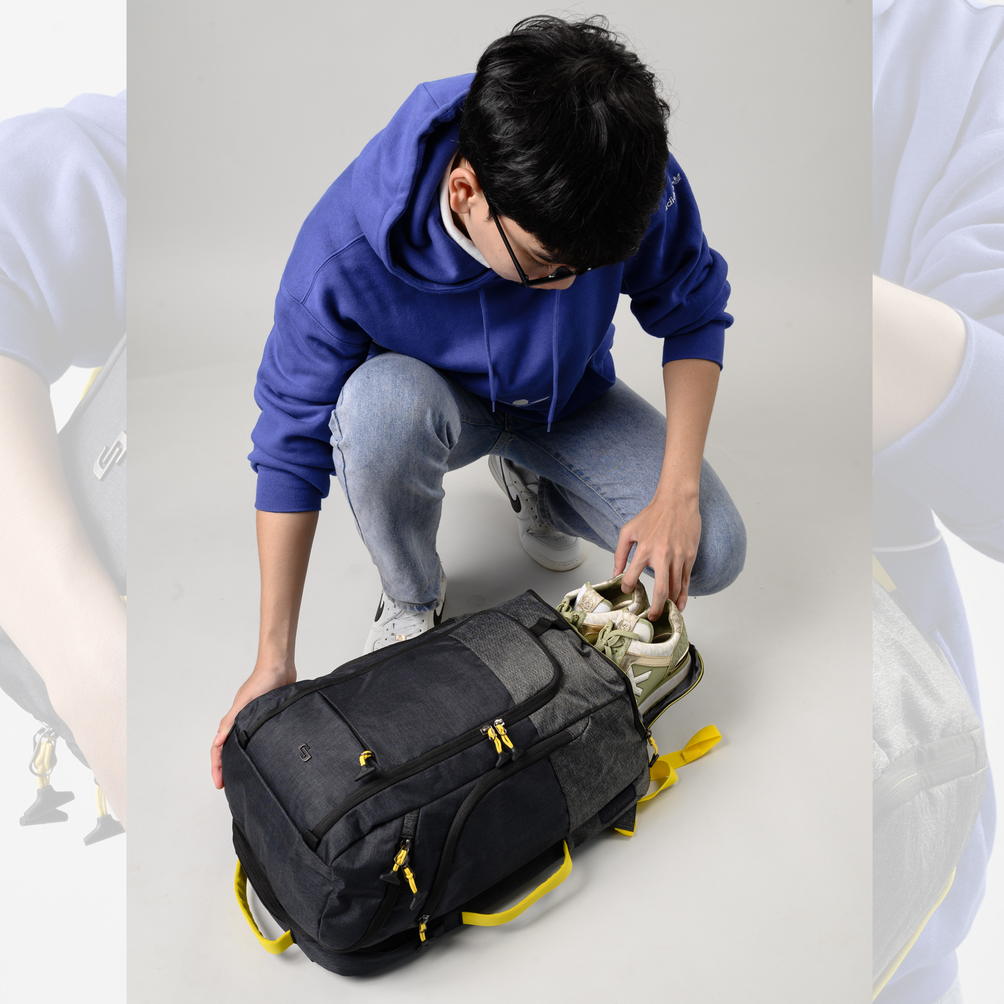 Ở 2 bên hông có thêm 2 ngăn kéo lớn, được thiết kế nổi bật bởi biểu tượng của Solo bằng kim loại đính vào sợi vải, giúp người dùng cất điện thoại hay những món đồ thường sử dụng. Khi đeo balo trên lưng, bạn có thể dễ dàng đưa tay ra sau lấy vật dụng nhanh chóng và tiện lợi.