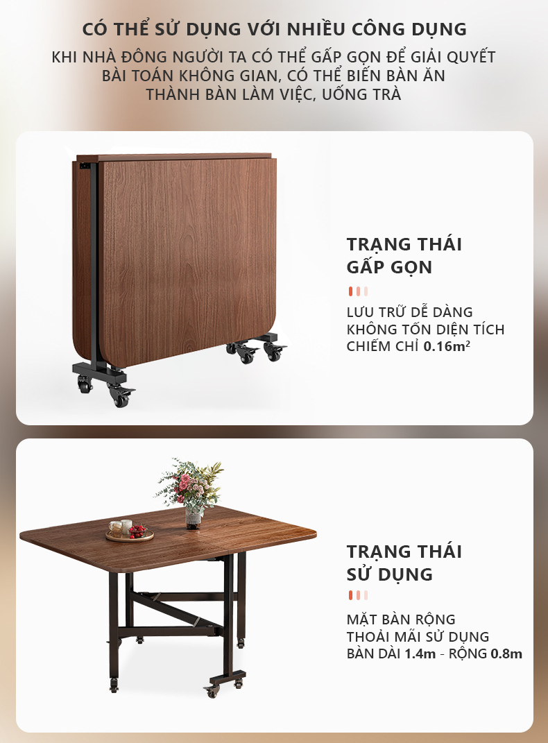 Công năng: Là mẫu bàn ăn có thiết kế thông minh đa dạng công năng khác nhau, thiết kế gấp gọn và bánh xe 360 giúp bạn tôi ưu diện tích không gian nội thất.