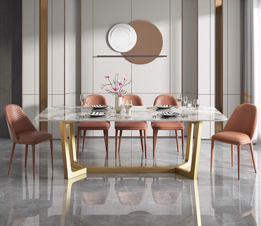Chất liệu: mặt đá ceramic chống thấm ố, trầy xước với những đường vân tinh tế, đẹp mắt đi kèm với chân inox mạ vàng PVD cao cấp chống gỉ.