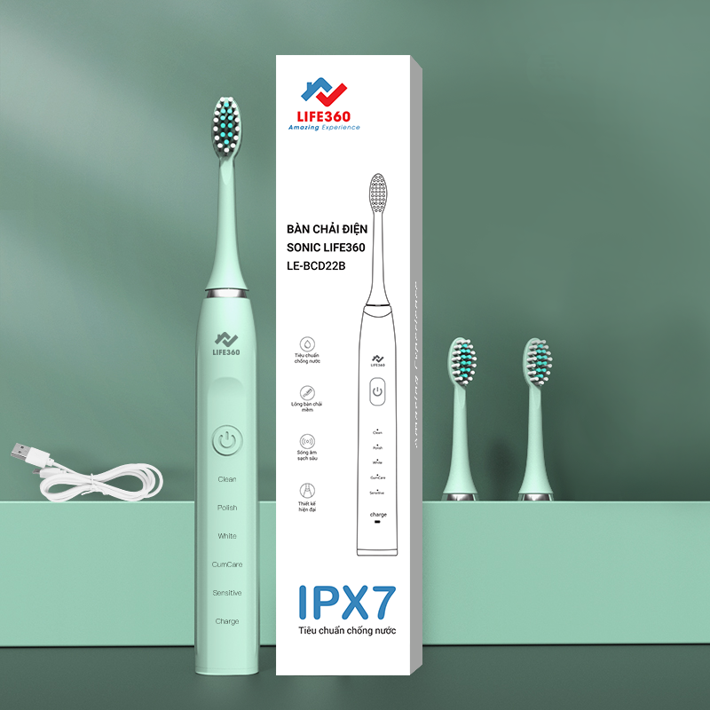 Bàn chải đánh răng thương hiệu Life 360 hiện có 5 chế độ chải răng linh hoạt bao gồm: Làm sạch, Đánh bóng, Làm trắng, Massage nướu, Cho răng nhạy cảm