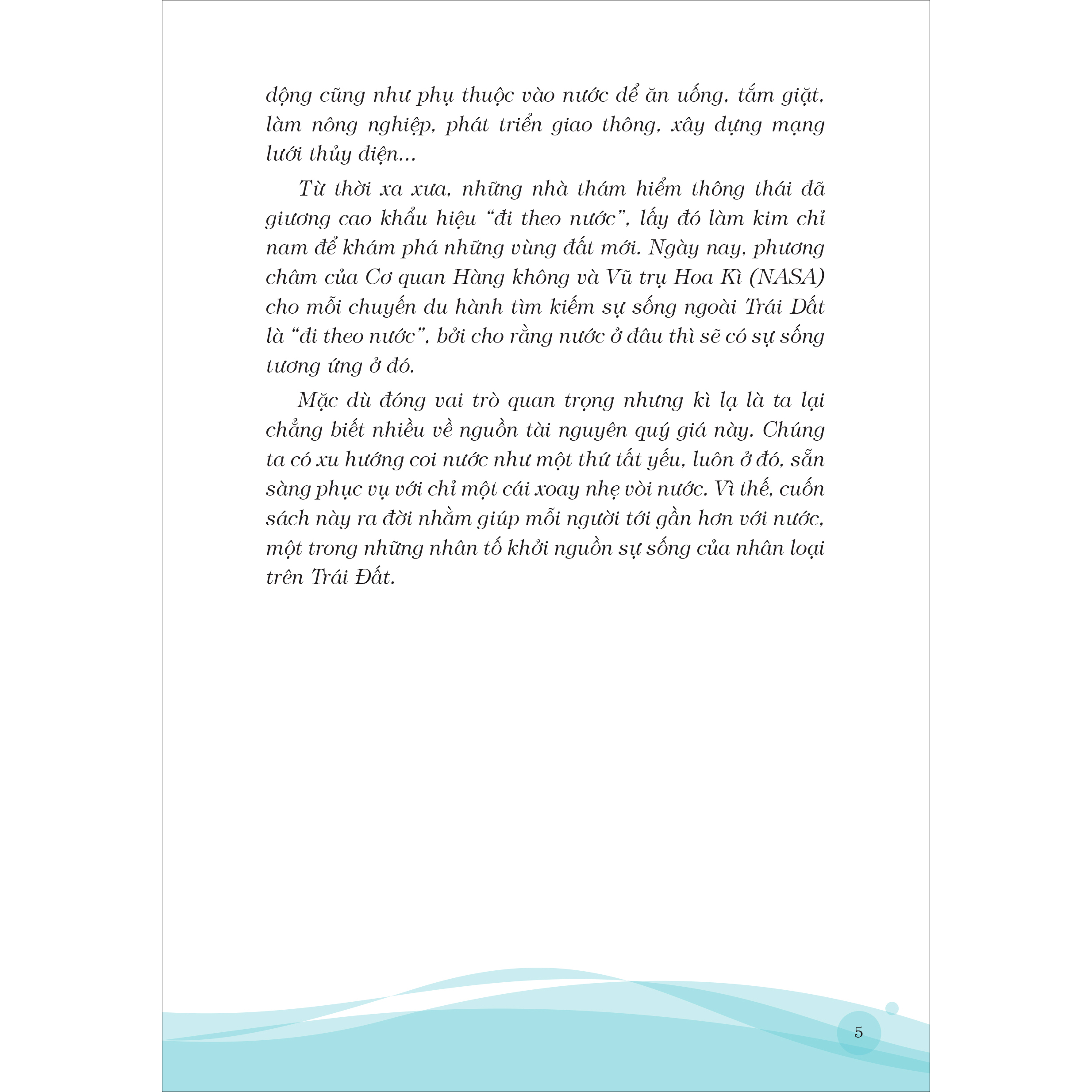 Trong bản hòa âm hùng tráng, mênh mang và mĩ lệ của Trái Đất, tồn tại một bản giao hưởng riêng không kém phần hài hòa, nhịp nhàng được kiến tạo bởi nguồn tài nguyên quý giá và quen thuộc với con người. Đó chính là nước. Nước bảo vệ chúng ta khi mới chỉ là bào thai trong bụng mẹ và tồn tại bên trong chúng ta suốt cuộc đời.