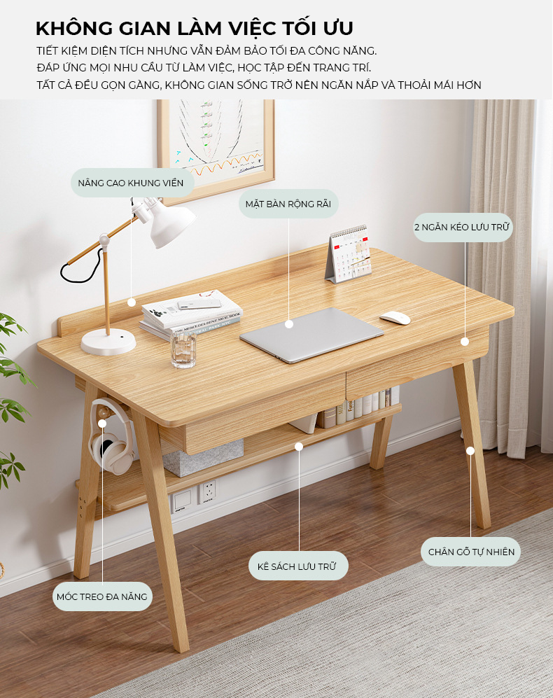 Công năng: Là mẫu bàn làm việc, bàn học giúp tiết kiệm diện tích không gian phòng