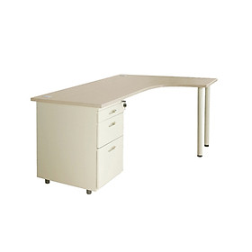 Bàn văn phòng góc phải có hộc sắt 3 ngăn kéo liền bàn, chân trụ tròn.