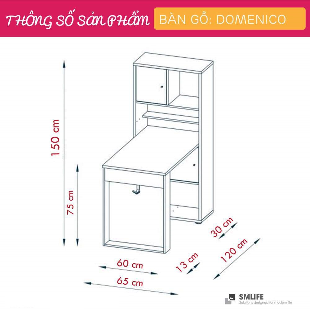 Mua tại TiktokMang đậm phong cách nội thất đơn giản, bàn làm việc gỗ Domenico là một sự bổ sung hoàn hảo cho phòng làm việc, phòng đọc sách của bạn. Bàn làm việc Domenico được thiết kế với nhiều tầng kệ và ngăn kéo mang đến nhiều không gian giúp bạn tổ chức sách vở và các vật dụng trang trí thoải mái. Sản phẩm là một giải pháp phù hợp cho những văn phòng hoặc căn hộ diện tích nhỏ. Sử dụng vật liệu ván ép công nghiệp MDF chống ẩm phủ Melamine cao cấp giúp bàn làm việc, bàn học gỗ SMLIFE có độ bền cao, chống trầy và chống ẩm rất tốt. Bạn có thể tự lắp đặt sản phẩm dễ dàng với các phụ kiện và hướng dẫn đi kèm.