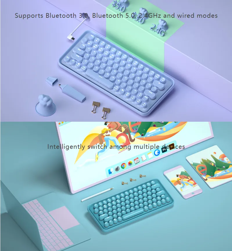 SPECIFICATIONS Model: FBX51C Operating Range: 10 M Connection: Bluetooth / 2.4G Multi-Device: 4 Devices ( BT*3, 2.4G*1) Layout: Windows |Android|Mac|iOS Character: Silk Printing + UV Battery: 300mAh Lithium Battery Receiver: Nano USB Receiver Net Weight:303