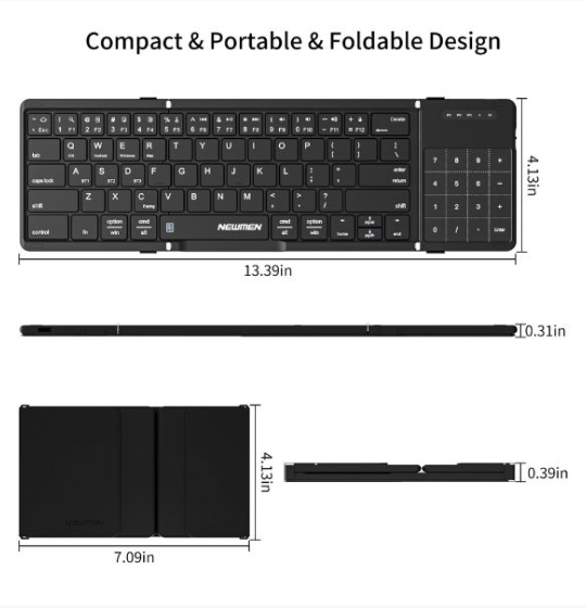 Newmen BK66 có thiết kế gập 3 phần độc đáo, giúp tối ưu không gian khi không sử dụng. Khi mở ra, bàn phím có kích thước đầy đủ, mang lại trải nghiệm gõ thoải mái. Khung bàn phím được làm từ hợp kim nhôm cao cấp, mang lại độ bền cao nhưng vẫn giữ được trọng lượng nhẹ.
