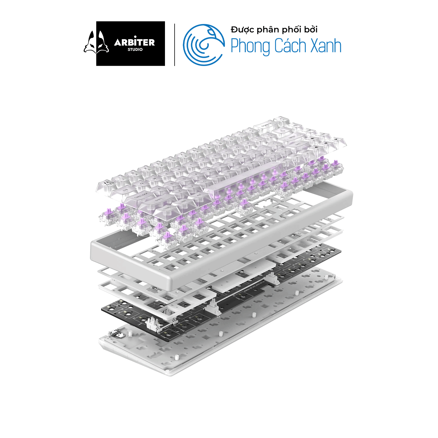 - Thiết kế bởi những nguyên liệu cao cấp Được thiết kế và sản xuất bởi Arbiter Studio, mỗi chi tiết trên bàn phím đều được thiết kế với thẩm mỹ cao nhất. Khung nhôm CNC được gia công chính xác giúp tăng độ bền và độ thẩm mỹ của bàn phím với các cạnh bo tròn chính xác hiếm thấy trên các khung nhựa truyền thống. Kết cấu đa lớp của bàn phím Arbiter Polar 65 gồm: