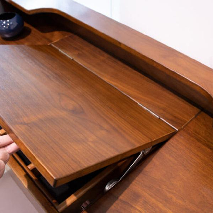 - Tính năng: Bàn trang điểm, bàn làm việc MÔ TẢ SẢN PHẨM Bàn trang điểm Value có thiết kế đơn giản, đường nét bo tròn mềm mại thể hiện phong cách tinh tế của gia chủ. Bàn trang điểm làm bằng gỗ cao su tự nhiên thân thiện với môi trường có độ dẻo dai và tuổi thọ sử dụng cao. Chân bàn được thiết kế trụ tròn cao tạo cảm giác tinh giản, thoáng đãng hơn cho không gian phòng. Đặc biệt điểm nhấn sơn vàng ở chân bàn làm tăng sự nổi bật cho sản phẩm. Mặt bàn được hoàn thiện bằng lớp veneer gỗ óc chó cao cấp giúp cảm nhận được vẻ đẹp của vân gỗ vốn có của gỗ thiên nhiên. Các chi tiết cấu tạo được lắp ráp hoàn hảo an toàn trong quá trình sử dụng. Bàn trang điểm có kèm gương, gập mở dễ dàng phù hợp với nhu cầu sử dụng hoặc yếu tố phong thủy trong phòng ngủ. Thiết kế nhiều ngăn chứa đồ tiện dụng giúp căn phòng gọn gàng hơn.