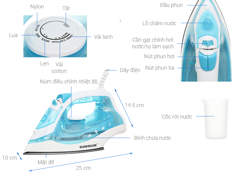 Ủi khô nhẹ nhàng, làm phẳng tốt hơn với chế độ ủi hơi nước, chế độ phun tia, phun hơi cho hơi nước giúp mềm vải dễ dàng làm phẳng vết nhăn cứng đầu, có thiết kế mũi nhọn giúp là ủi dễ dàng mọi vị trí trên quần áo, ngay cả rãnh cúc áo