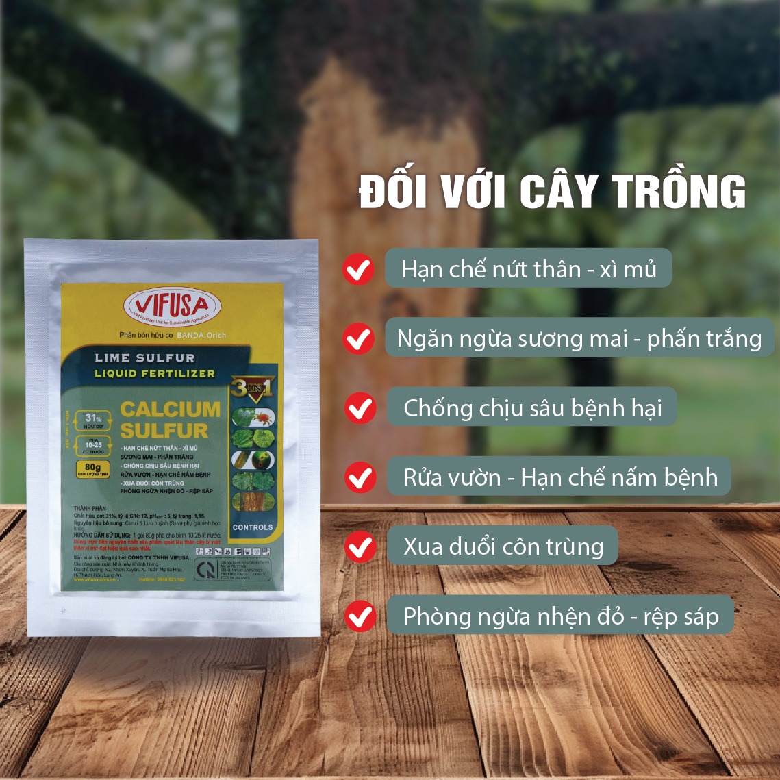 - Ngoài ra, phụ gia chứa lưu huỳnh (S) dạng Calcium Polysulfide 24% hạn chế nấm bệnh gây nứt thân xì mủ, sương mai, phấn trắng và bệnh do nhện gây ra.