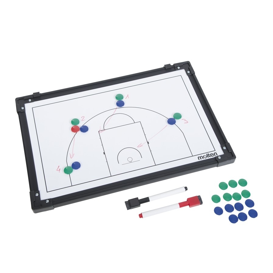 Bảng chiến thuật bóng rổ Sản xuất tại: Đài Loan Nhãn hiệu: Molten Kích thước: 45 x 30,5cm Bảng với các mảnh từ tính, đánh dấu màu xanh lá và xanh navy. Có túi đựng.