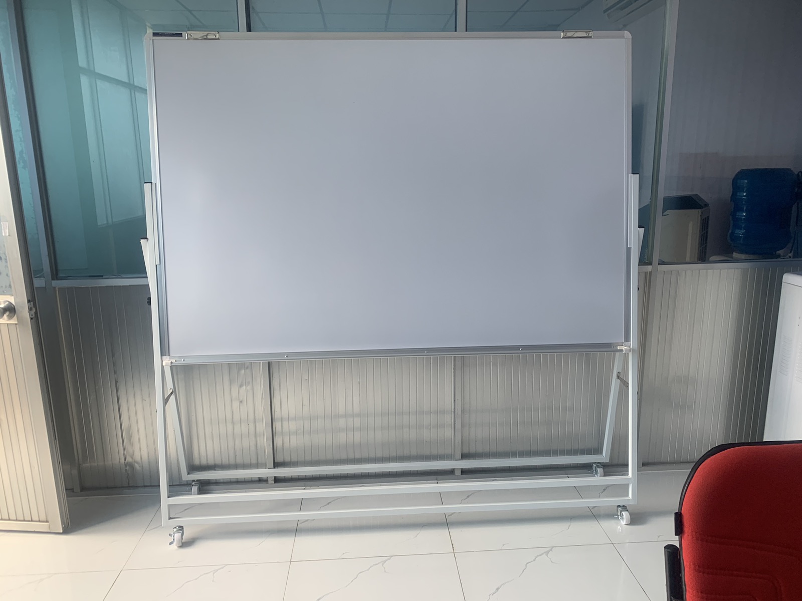 - Bốn cạnh của bảng flipchart được bọc khung nhôm chuyên dụng, trắng bóng, mang lại tính thẩm mỹ cao. Khung nhôm được thiết kế chắc chắn, có tác dụng chống oxy hóa, đảm bảo tính chịu lực cao.